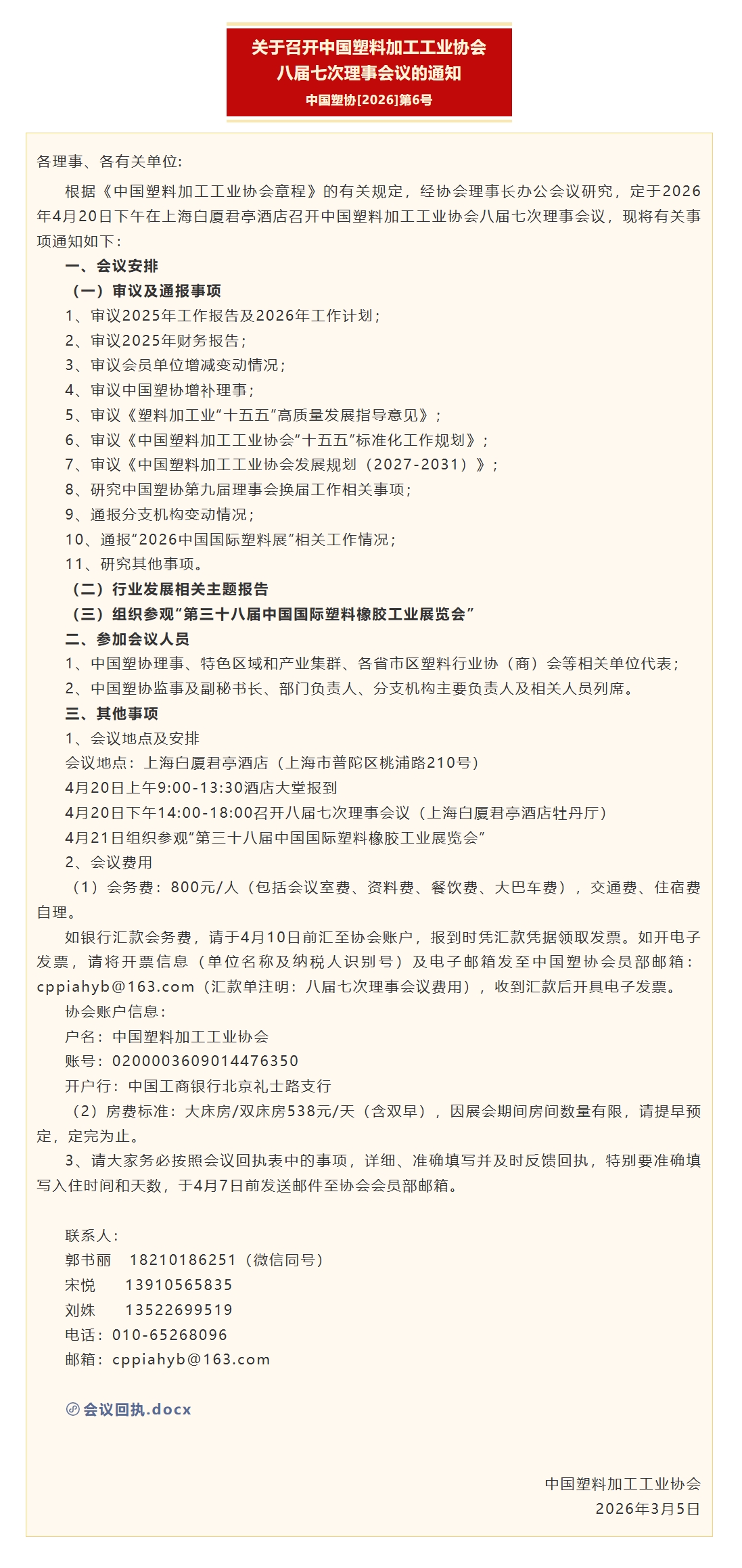 关于召开中国塑料加工工业协会八届七次理事会议的通知