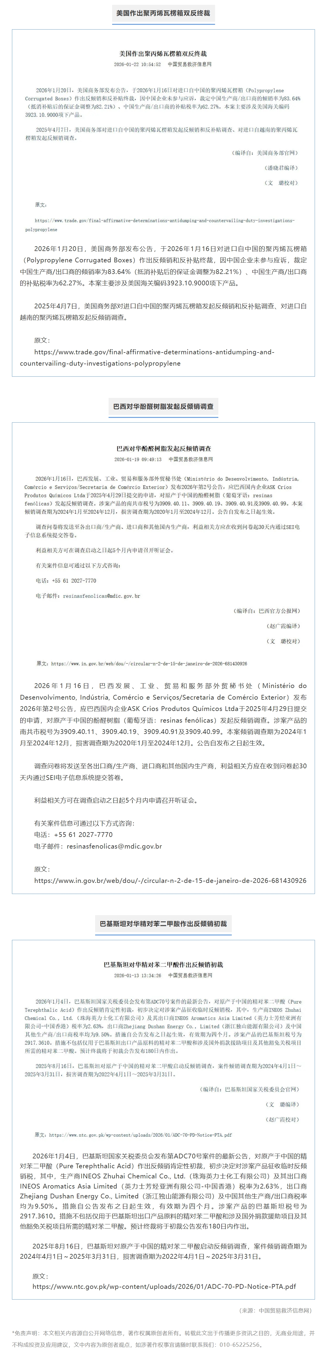 外贸预警 | 近期各国对华塑料及相关行业反倾销调查公告摘要