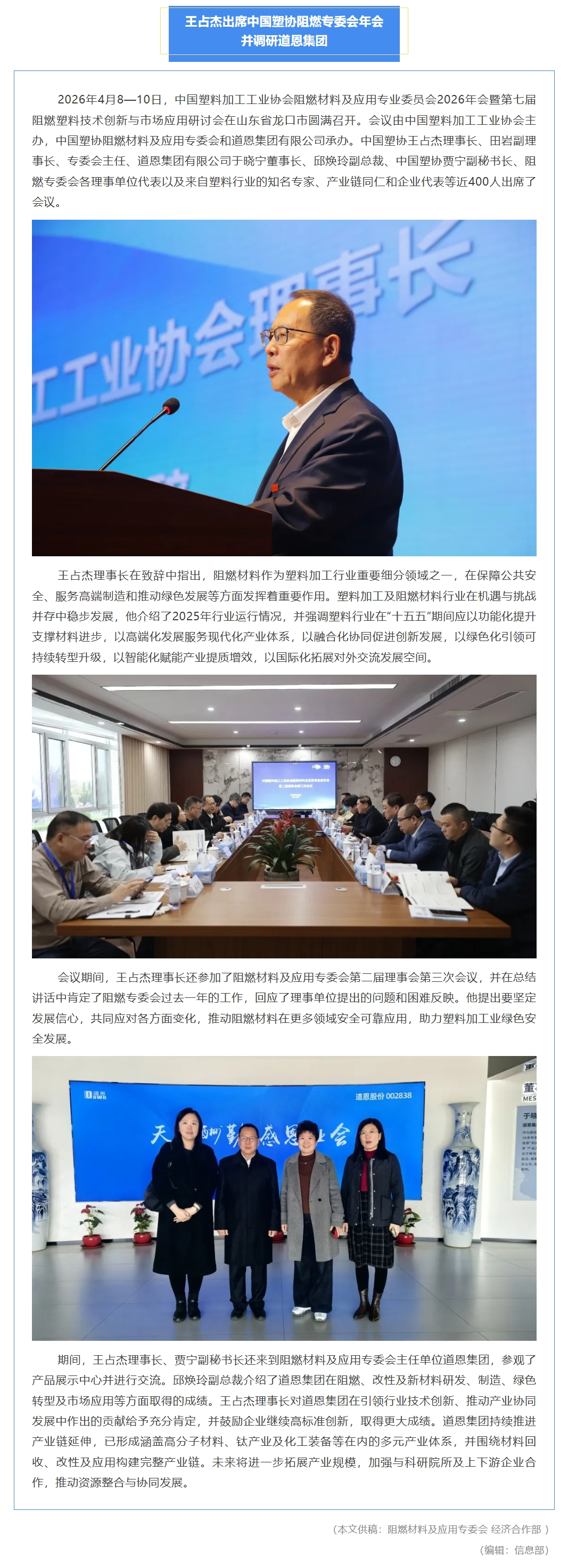 王占杰出席中国塑协阻燃专委会年会并调研道恩集团