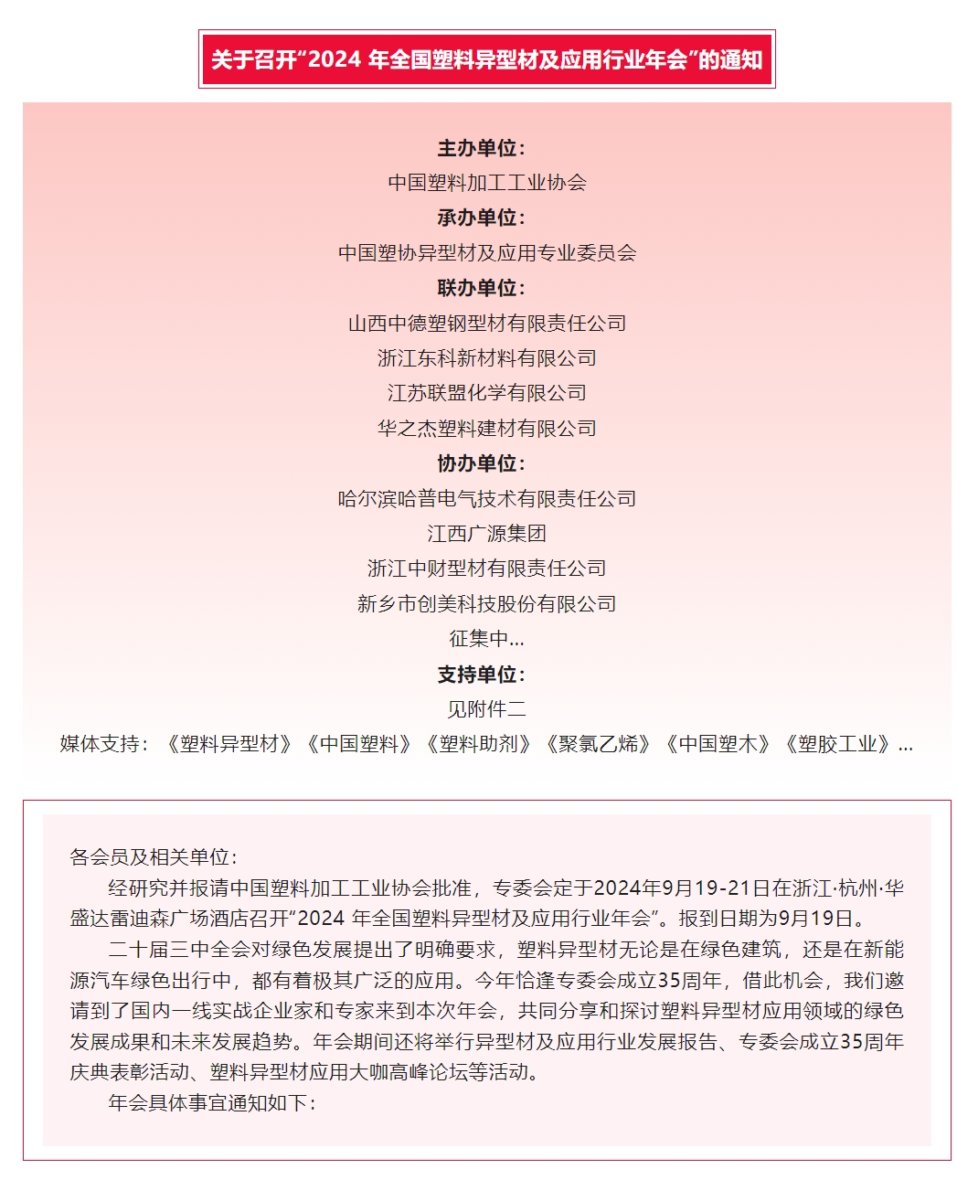 关于召开“2024 年全国塑料异型材及应用行业年会”的通知