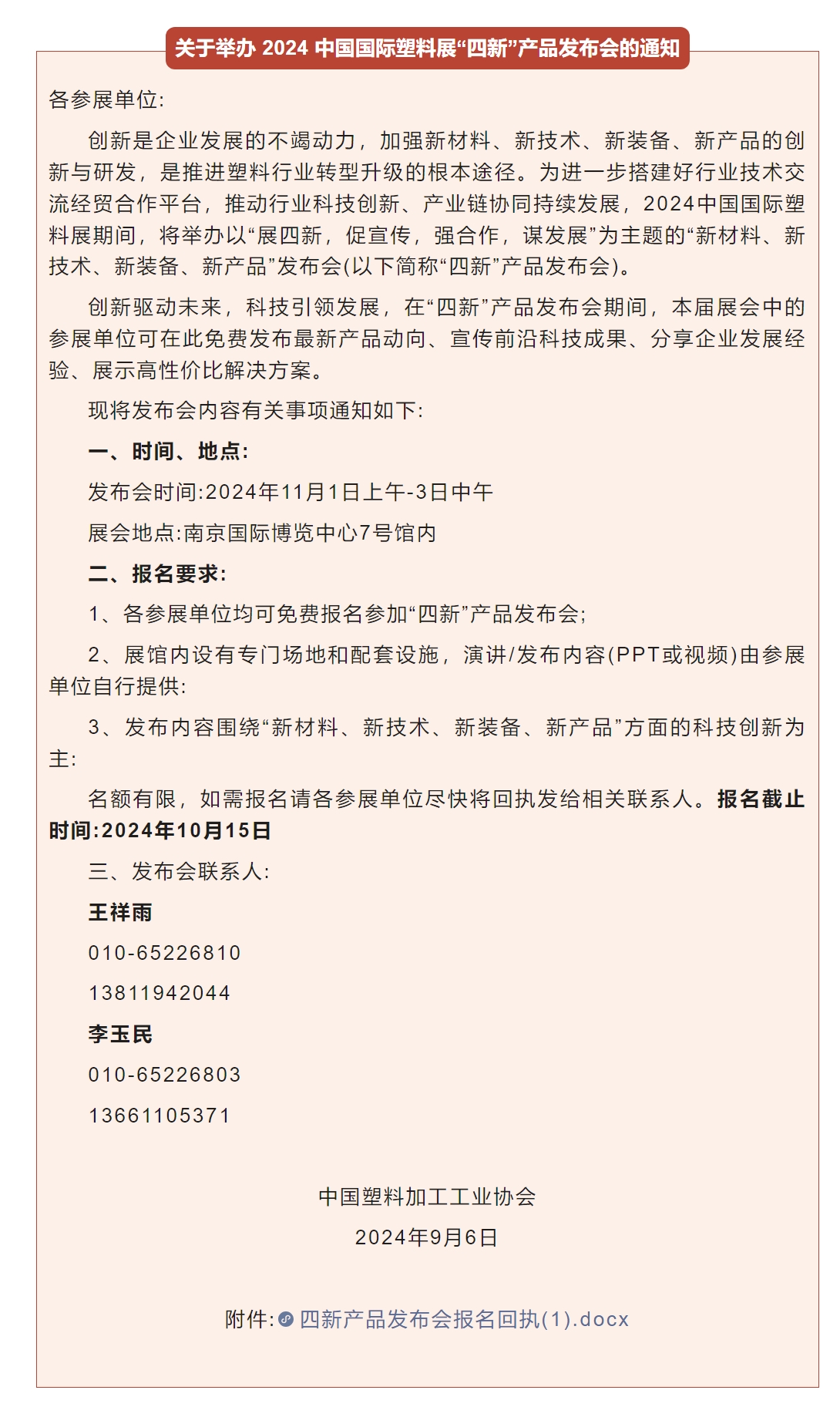 关于举办 2024 中国国际塑料展“四新”产品发布会的通知