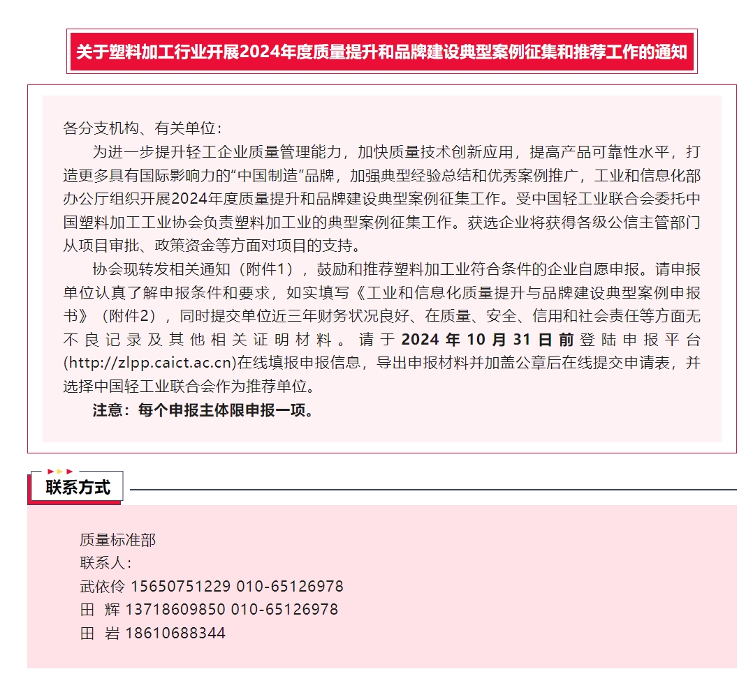 关于塑料加工行业开展2024年度质量提升和品牌建设典型案例征集和推荐工作的通知