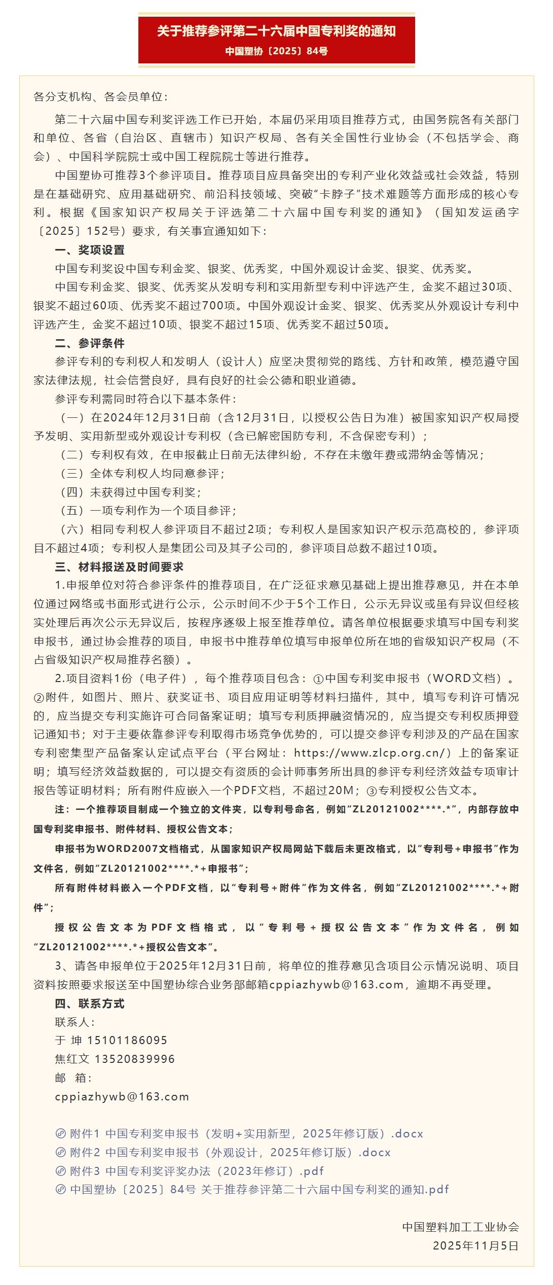 中国塑协〔2025〕84号 关于推荐参评第二十六届中国专利奖的通知.pdf