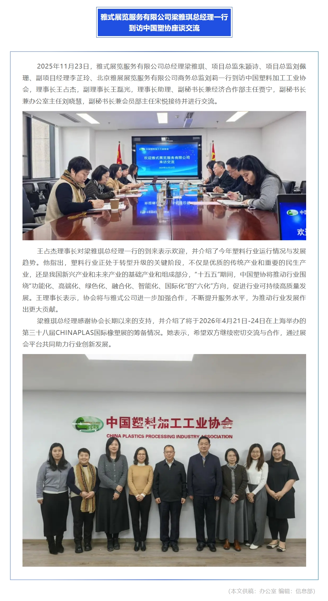 雅式展览服务有限公司梁雅琪总经理一行到访中国塑协座谈交流