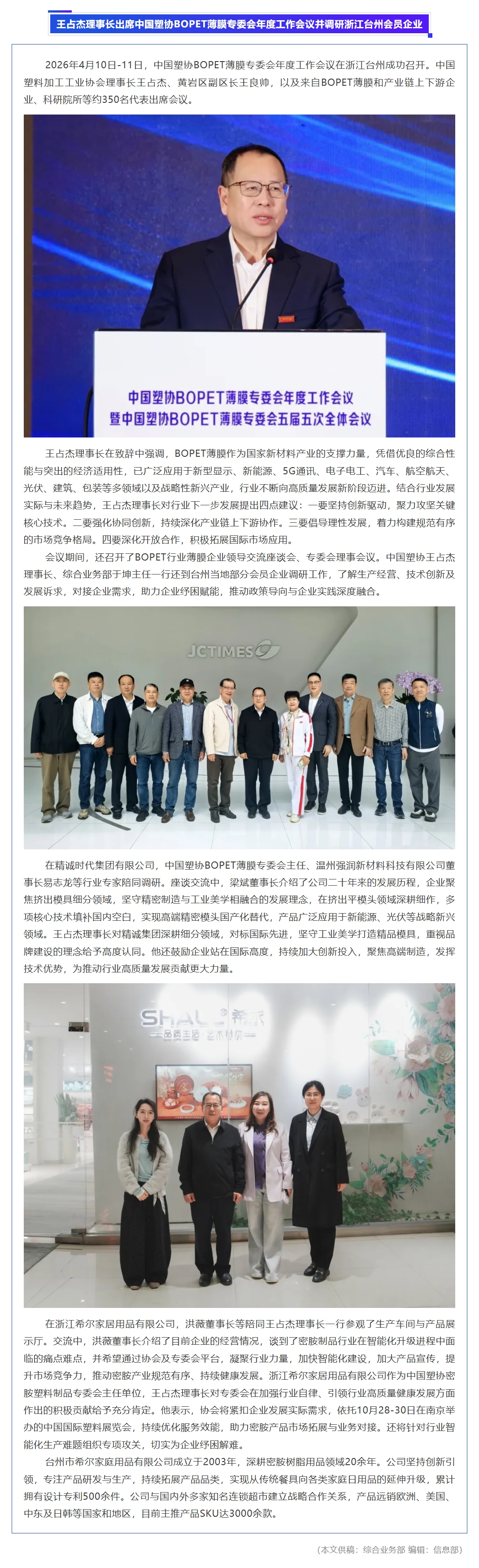 王占杰理事长出席中国塑协BOPET薄膜专委会年度工作会议并调研浙江台州会员企业